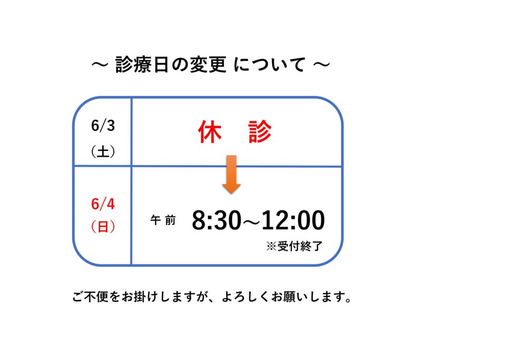 6/3(土)臨時休診。変わって、6/4(日)診療します。※尚、受付時間は8:30~12:00とさせて頂きます。